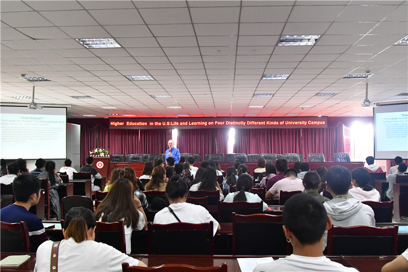 Bowie教授分析了美国大学(University)和学院(College)的不同,大学侧重对学生综合性学术能力的培养,而学院则注重培养学生实践技能,他通过自身在不同学校的工作经历,向师生讲述了他对美国大学生学习生活的看法。Bowie教授重点向同学们介绍了美国高校的四种类型,分别是大型公立研究型大学、常青藤大学、教会/社区类大学、私立研究型大学,他以朴素生动的语言详细介绍了这些学校相关管理招生录取制度和学习与生活对于学生们的影响,分析了各自的优势与劣势。