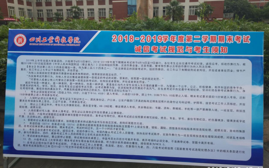 基础课教学部也以横幅和展板的形式向全校学生宣传全国大学英语四、六级诚信考试规范和考生须知,加强学生的诚信意识。并通过考试动员暨诚信考试教育系列活动的有效开展,促进我校学生诚实守信,提升个人修养,争取在各项考试中考出水平,考出素质,展现川工科风采,继续巩固我校严谨治学的优良传统。