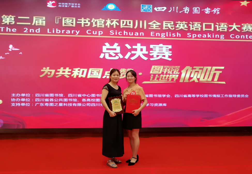 6月29日上午,第二届“图书馆杯四川全民英语口语大赛暨全国首届图书馆杯全民英语口语风采展示活动”四川赛区总决赛,在四川省图书馆举行,大赛以“为共和国点赞·图书馆,让世界倾听”为主题,20位来自全省各地的英语口语爱好者在决赛现场围绕英文演讲、即兴主题对话、现场问答等环节展开激烈角逐。最终我校学生唐娜娜荣获三等奖,我校图书馆荣获优秀组织奖。