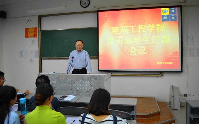 9月23日,建筑工程学院第五届学生干部会议在钟灵教学楼召开,执行校长唐健禾教授出席会议并发表重要讲话。学院院长罗运辉、党支部副书记杨春、全体辅导员、学生干部及各班班长参加了会议。会议由学生会主席李鸿主持。
