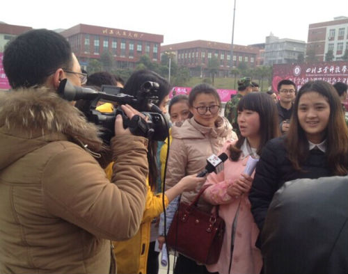 (2013级建筑工程管理4班学生何玉林在接受四川电视台采访)