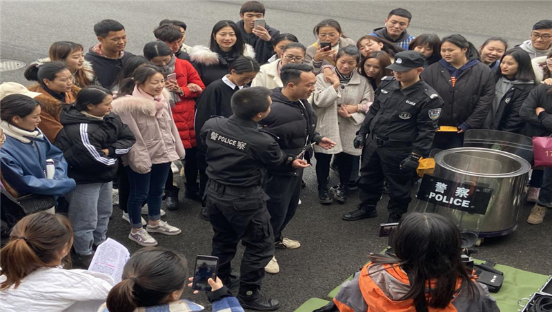 在辅导员张航老师、科任教师李长福、张蕊老师的陪同下,18级法律文秘全体学生来到罗江区法院。接待学院师生的罗江区法院办公室寇主任首先带领同学们参观了立案庭,并由立案庭的工作人员仔细讲解了立案的具体流程,帮助大家进一步认识诉讼程序中第一个环节立案的重要性和必要性。随后来到了科技法庭,科技法庭里呈现的现代化科技审判设施和设备,给同学们留下很深的印象。紧跟着同学们来到区法院的院子,一群司法警察等着为同学们展示诉讼过程中可能会用到的警械装备比如:防刺衣、防爆桶、远距离抗捕钢叉等。同学们对这些高科技的警械装备非常感兴趣,积极询问其用途,使用方法等,其中一名同学还很荣幸的充当了一次“犯罪嫌疑人”,被戴上了手铐和脚铐。