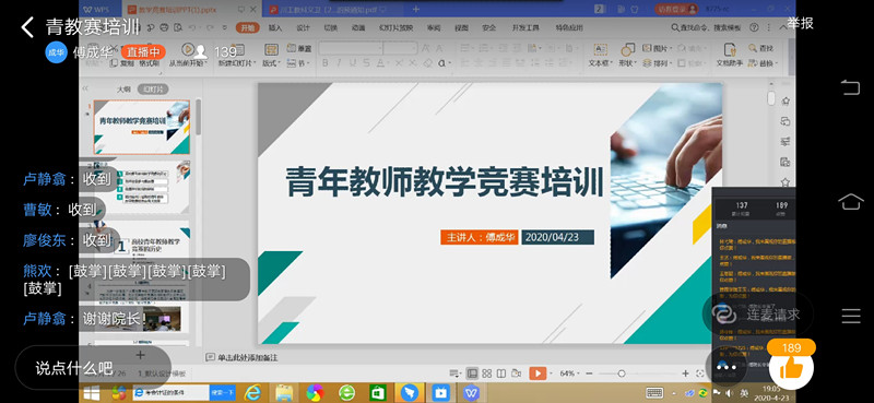 青年教师是学校的未来和希望,青年教师的快速成长和进步对学校的未来有着至关重要的作用,是学校实现可持续发展的关键所在。为了提高青年教师教学能力和参赛水平,促进青年教师的成长与发展。4月23日学校特邀四川省青年教师课堂教学比赛一、三、四届评委、电信学院傅成华教授在钉钉软件直播群为我校青年教师进行“高校青年教师教学竞赛”专题培训讲座。各教学单位积极认真落实,共有140余名青年教师聆听了傅教授的讲座。