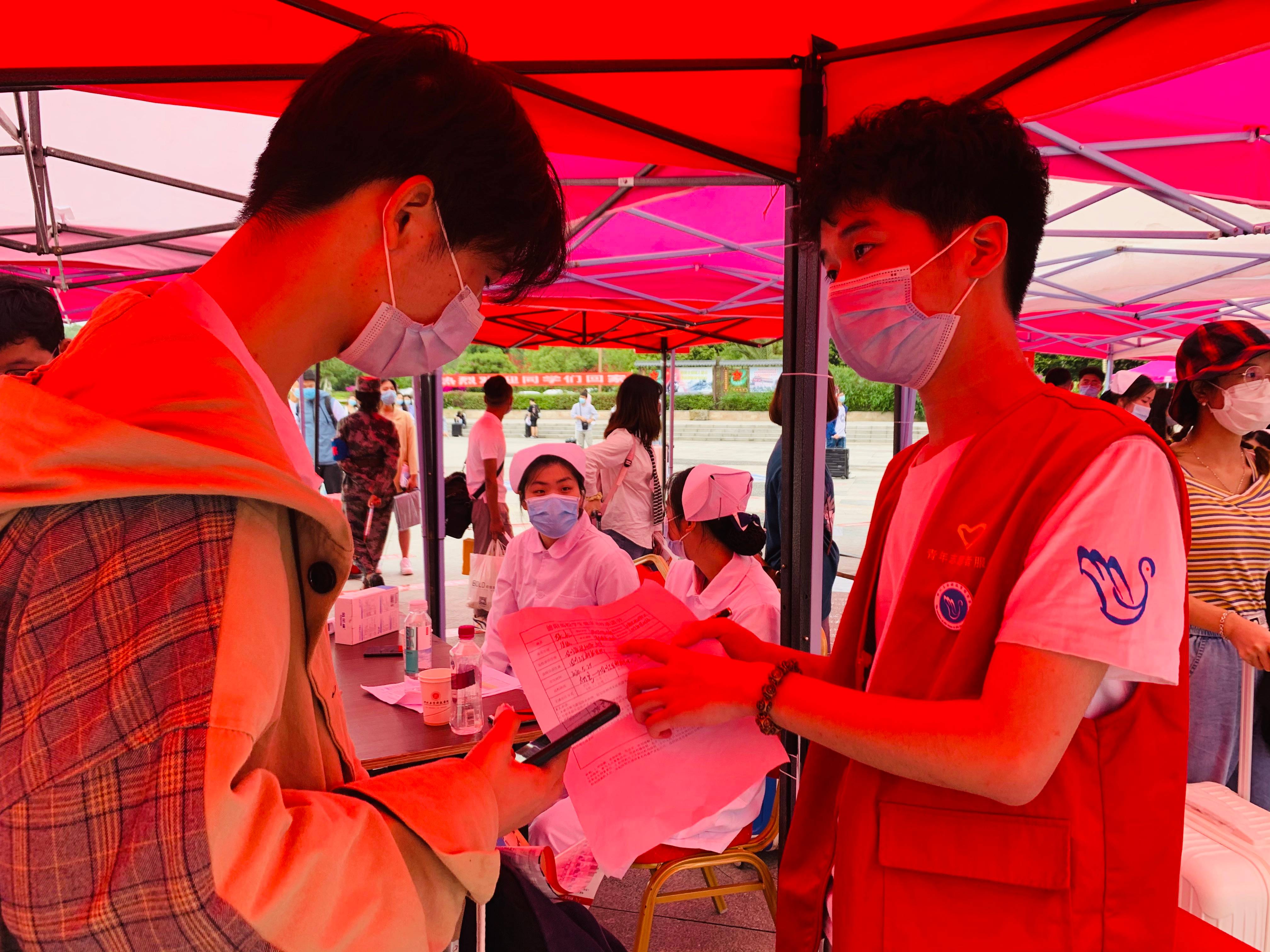 志愿者队伍主要由校学生会学生干部、护理学院取得护士资格证的学生、教官队、特训队成员组成。经过集中培训,实战演练,志愿者们被分配到各个岗位上,他们分工合作。志愿者们从校门口协助交警引导控制车流,为返校同学详细讲解返校流程,指引同学按流程登记进校,帮助同学搬运大件行李,协助相关工作人员测量体温和登记信息,用实际行动把好入校第一关,服务同学返校,确保校园安全。