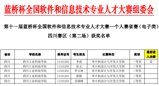 10月26日,“蓝桥杯”组委会公布了第十一届全国软件和信息技术专业人才大赛—个人赛省赛(电子类)四川赛区(第二场)获奖名单,我校共15名学生参赛,获得一等奖一项,二等奖三项,三等奖一项,我校电子信息与计算机工程学院学生李虎优先进入全国总决赛。