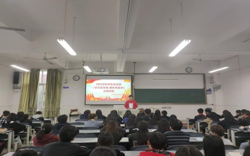 10月23日下午,财经学院在毓秀201召开主题为“学党章党规 做优秀表率”的主题讲座,参加此次讲座的有财经学院党总支副书记杨永岗、全体学生党员、学生预备党员及全体入党积极分子。此次讲座由周玉鑫主持。