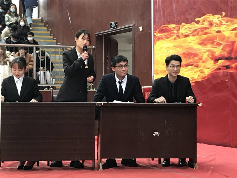 本次比赛,担任评委和嘉宾的有:北京启航考研四川片区校区主管刘兵,语言文字委员会副主任刘琴,法律教研室主任李长福,思政部老师李海伟。我方为正方观点,由队长及一辩王诗富带队,张宇(二辩),熊银凤(三辩),于洋(四辩)组成了我方队伍,而反方队伍西南财经大学天府学院则由鲁紫依(一辩),韦丽丽(二辩),张力(三辩)肖文馨(四辩)组成。比赛进行过程中,八位辩手旁征博引、妙语连珠,结合理论与现实充分论证了社会看脸与否的问题,双方针锋相对互不相让,为大家奉献了一场有理有据的精彩辩论。经过立论陈词、攻辩阶段、攻辩小结、自由辩和总结陈词五个环节环环紧扣的激战,现场观众也是大呼过瘾。其中“抬杠”环节更是将比赛的气氛推至高潮,双方围绕各自的论点你来我往,互不相让。
