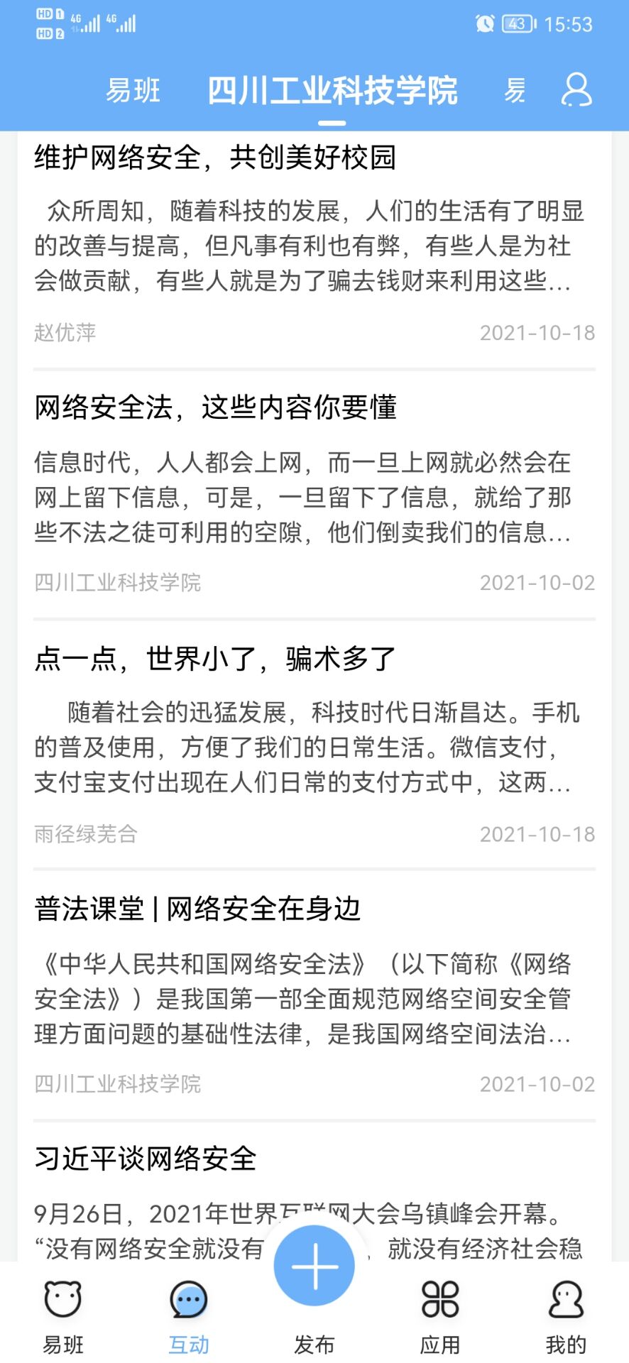 四川工业科技学院易班围绕党的十八大以来网络安全领域取得的重大成就,以“网络安全为人民,网络安全靠人民”为主题,开展形式多样的宣传教育活动,引导广大青年学生提高网络安全意识,提升防护技能和网络素养,号召广大青年学生争做中国好网民。