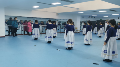 老师因疫情居家隔离,不能到教室教学,针对此种情况,我们采取的是学生到教室上课,老师通过线上直播的形式教学。这些课程中,舞蹈课有其自身的特殊性,需教师大量示范动作,因此教师通过腾讯会议教学,一方面便于学生学习,另一方面便于教师掌握学生学习情况,及时纠正和整改。