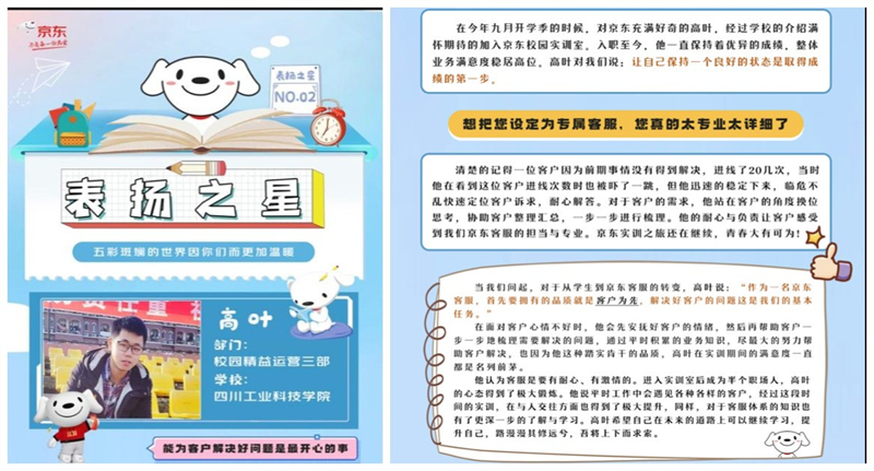 本年度,学院组织了四批次共计358位同学开展了校内培训课程,成功完成了清明节、“5·1”劳动节、“6·18”、国庆节、“11·11”等节假日的电商大促活动。同学们态度积极、实训认真、表现优异,获得了京东零售相关领导的一致肯定。其中,2019级国际经济与贸易1班高叶同学因其娴熟的沟通技巧,高效的服务记录成功加入京东零售优秀录音库,并作为校企合作优秀案例分享,得到京东零售客服运营部全员邮件表扬。