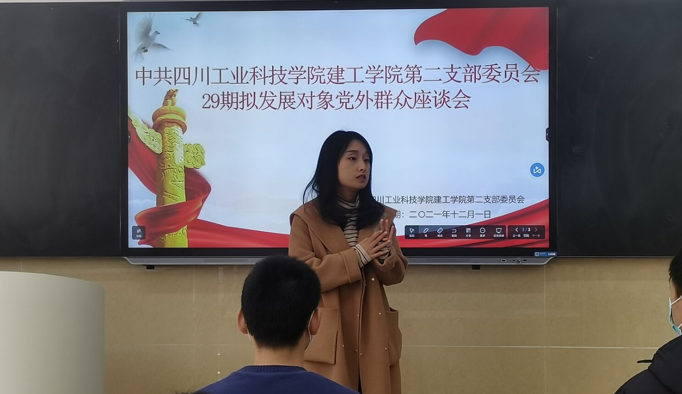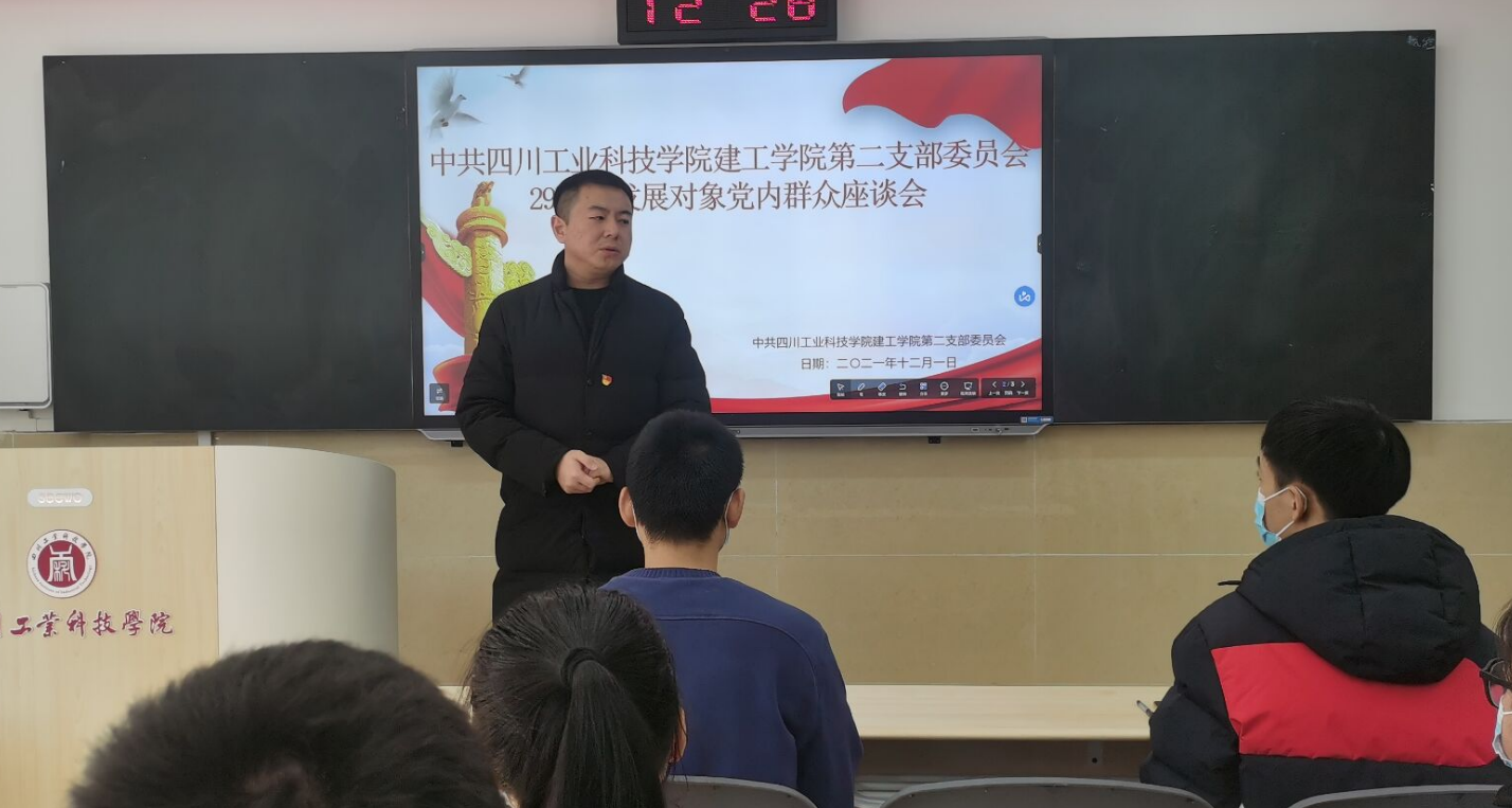 12月1日,建工学院第二支部委员会为加强拟发展对象思想政治教育工作,在学校龑江学村C-413组织开展了第29批拟发展党员党内外座谈会。学院支委及29拟发展学生参加座谈会。学院第二支部委员会书记蔡明主持会议。