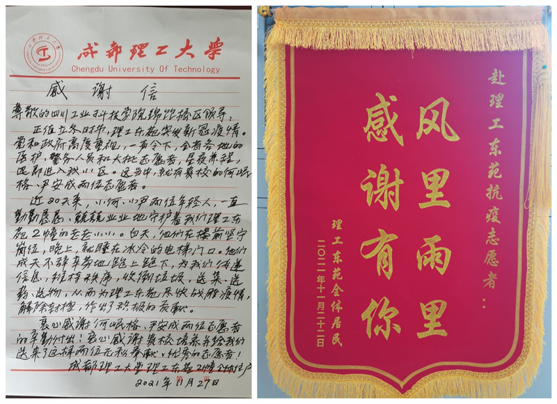 正值立冬时节,成都理工东菀突发新冠疫情。四川工业科技学院体育学院19级学生何岷格、尹安成两位同学响应党和政府的号召,不顾危险,自愿奔赴成都理工东菀参加抗疫志愿者,为人们保驾护航。疫情结束后,成都理工大学特此为我校送来感谢信。