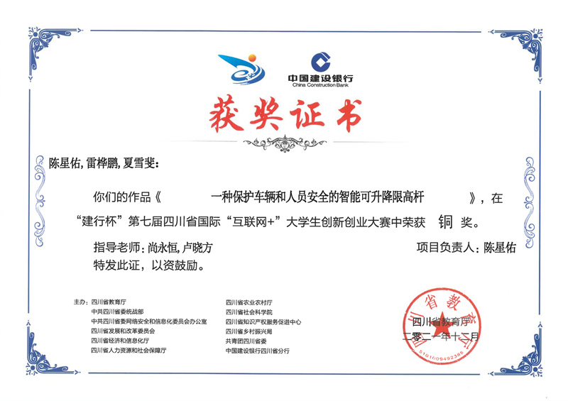 近日,四川省教育厅公布了第七届四川省“互联网+”学生创新创业大赛决赛获奖项目名单,学校陈星佑、雷桦鹏、夏雪斐同学《一种保护车辆和人员安全的智能可升降限高杆》项目和李鸿浒、母鸿坤、帅杨同学《基于树莓派的人脸识别系统的设计》2个项目分获铜奖。