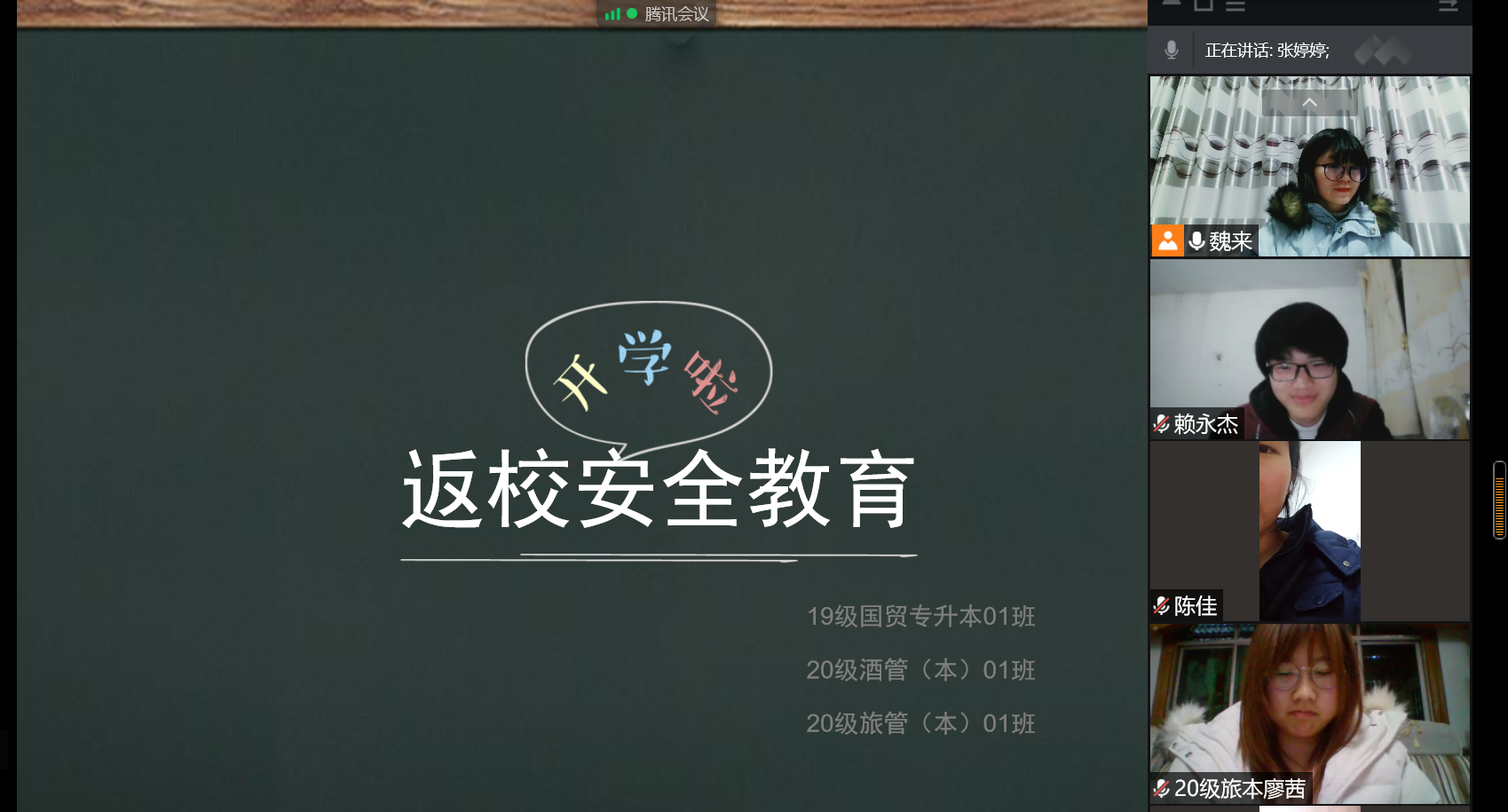 临近返校,为确保开学工作顺利进行,根据四川省疫情防控指挥部关于返岗返校人员疫情防控工作的要求,结合学校工作实际,管理学院学工队伍在党总支副书记张东国的组织下,于2月13日-15日先后组织班级学生开展了线上返校安全教育主题班会,确保学生熟知返校要求及返校报道流程,顺利返校。