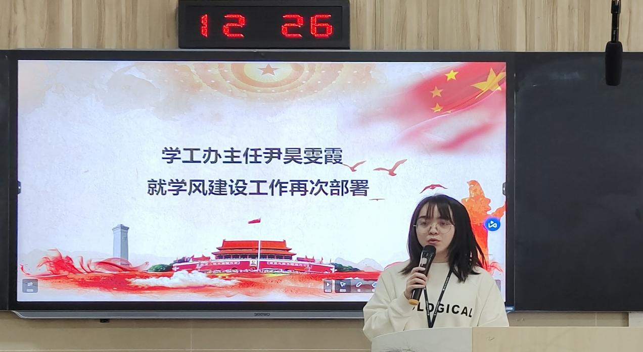 会议在共青团团歌中展开。学工办主任尹昊雯霞老师就学院学风建设工作再次部署,在强调学院加强学风建设必要性的同时,也强调了学生安全注意事项;马克思主义学院红色歌谣研究中心冯军成老师为同学们带来了开学第一堂团课;团总支学生会代表朱乾发和学生干部代表彭琳就团风、学风建设发言,号召大家积极学习团的有关知识,加强自身道德修养,做一位合格的学生干部。