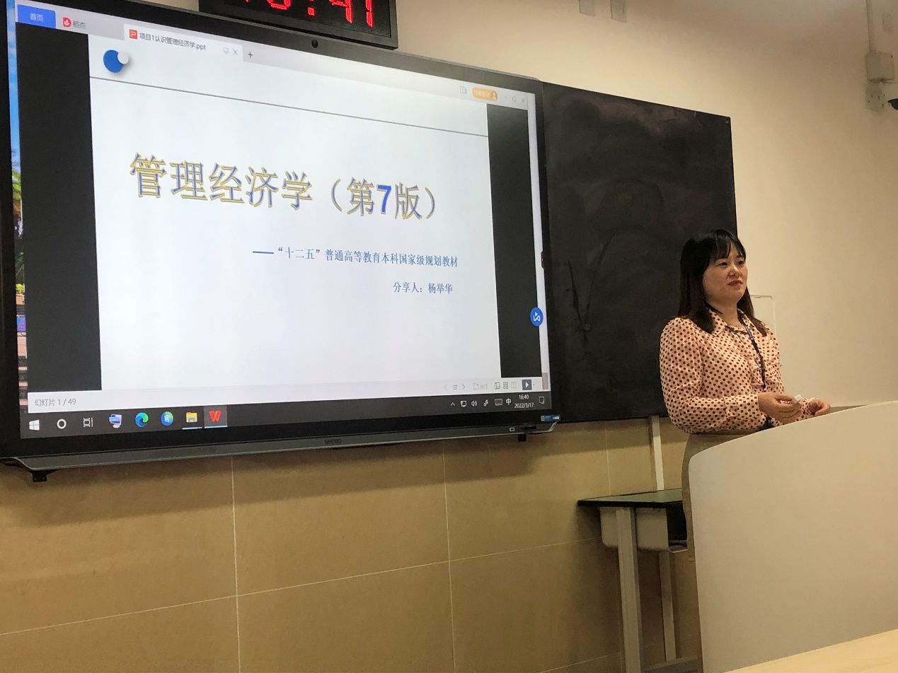 随后,杨举华老师带领全体老师走进《管理经济学》的课堂。杨老师从经济学的萌芽深入到现代经济学的产生发展,告诉大家什么是经济学。她从身边喜闻乐见的案例出发,带着全体老师了解人的欲望的无限性以及资源的稀缺性,最后揭示经济学就是研究稀缺资源的配置和利用的一门课程。