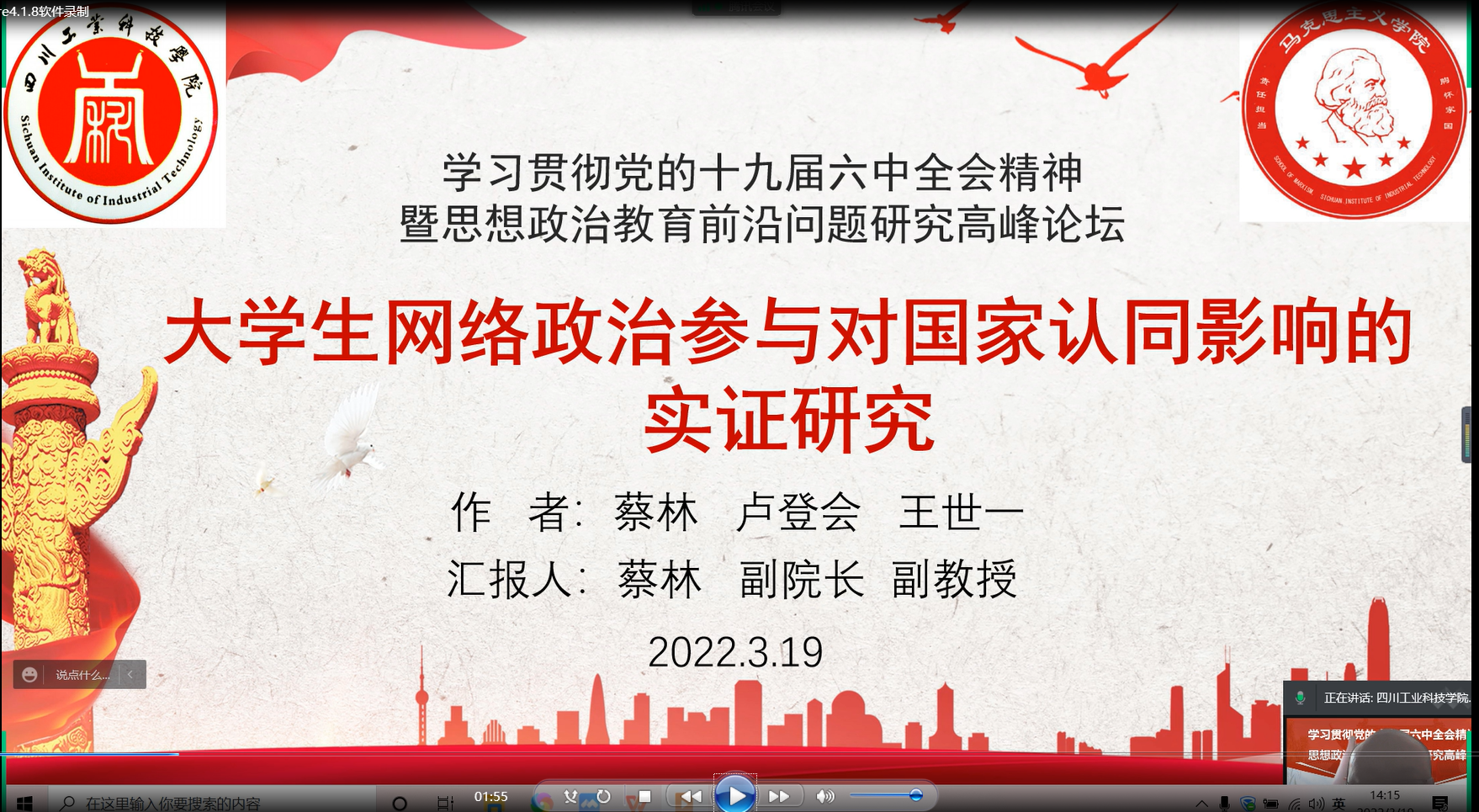 为进一步学习贯彻党的十九届六中全会精神和习近平总书记“3?18”重要讲话精神,喜迎党的“二十大”,3月19日,由《社会主义核心价值观研究》编辑部、《思想政治教育研究》编辑部和四川大学马克思主义学院主办的“学习贯彻党的十九届六中全会精神暨思想政治教育前沿问题研究”高峰论坛在四川大学隆重召开。我校马克思主义学院党总支副书记、副院长蔡林副教授和我校两位本科生卢登会、王世一应邀参加本次高峰论坛。