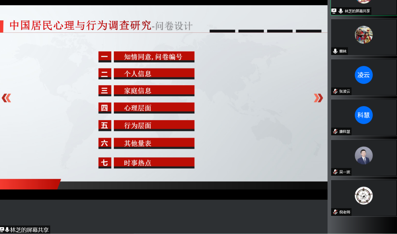 为进一步促进中国居民心理与行为调查研究(China psychology and behavior study,CPBS)问卷内容合理性和科学性,更好的吸取各位专家老师的意见。4月25日下午,中国居民心理与行为调查研究负责人吴一波研究员邀请德阳市哲学社会科学重点研究基地心理与行为研究中心负责人,学校马克思主义学院蔡林及其研究团队进行线上研讨。会议由吴一波主持。