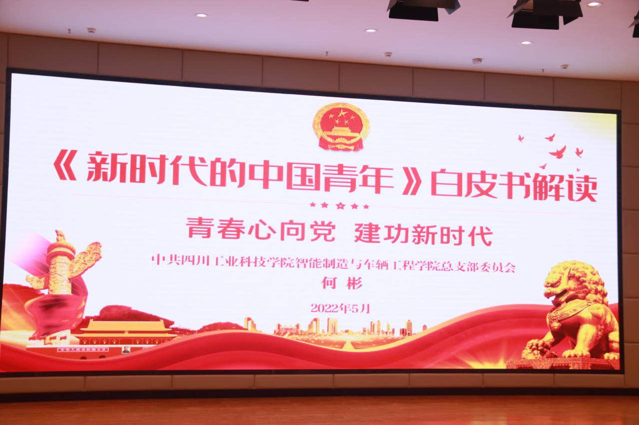 5月8日下午四川工业科技学院智能制造与车辆工程学院党总支在龑江C区负一楼科技厅开展关于《新时代的中国青年》白皮书解读和学习活动,意为深入理解新时代中国青年的责任与担当。本次活动由学院第二支部书记何彬老师主讲,学院党总支副书记马志雪老师及全院学生党员、预备党员、入党积极分子参加本次活动。