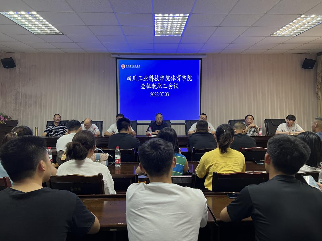 7月3日下午,四川工业科技学院体育学院在绵竹校区142会议室召开全体教职工大会。体育学院院长邓跃宁、执行院长雷耀方、党总支副书记魏天强以及体育学院全体教职工参加了会议。会议由体育学院执行院长雷耀方主持。