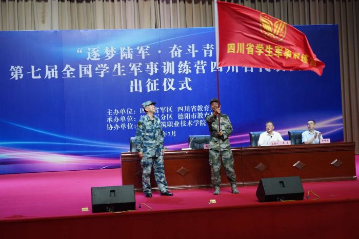 7月21日上午,第七届全国学生军事训练营四川省代表队出征仪式在四川建筑职业技术学院隆重举行。德阳市委常委、德阳军分区司令员赵创业、战备建设处处长杨勇、德阳市教育局局长屈直出席活动。