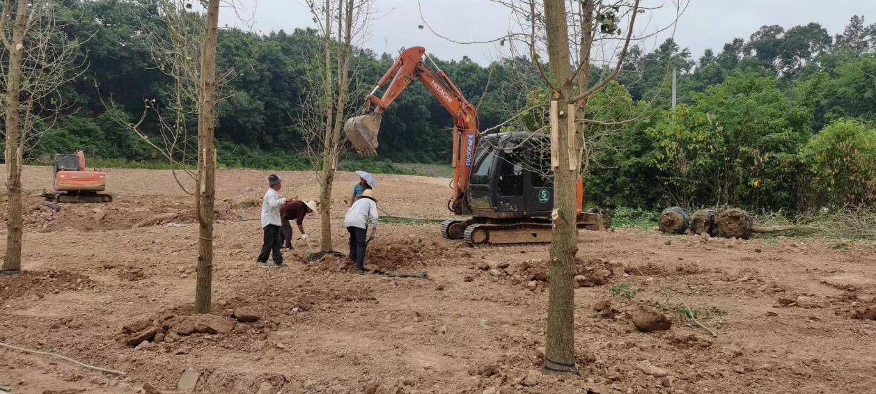 工作过程井然有序:施工前,通过对土壤贫瘠程度、板结程度及土壤的酸碱性进行分析,选择了适宜种植的花草树木;施工中,通过挖掘机进行挖坑及吊运移植工作,工人们负责覆土压实及平铺草皮,两者配合,有条不紊;施工后,对移植树木浇透水、施好肥,做好支撑工作,防止树木在根系扎稳之前偏倒。