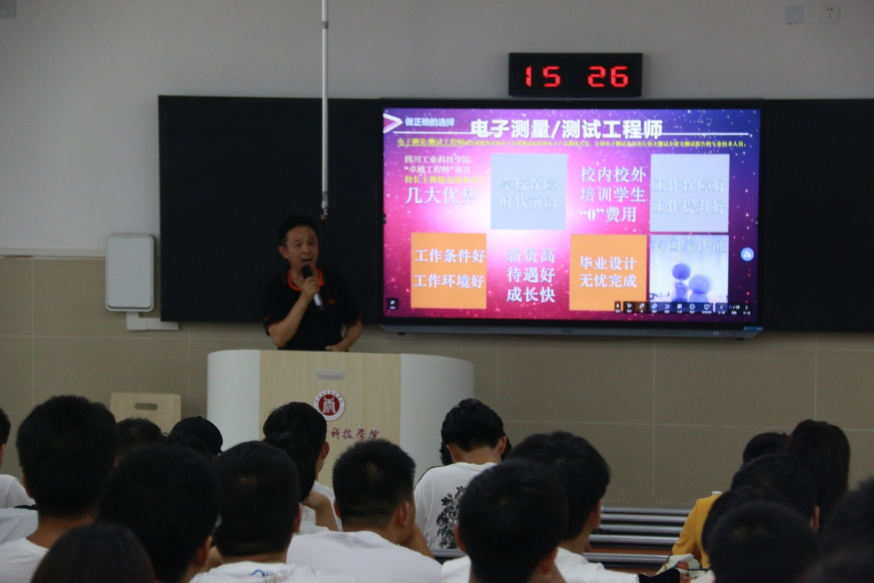 本次宣讲推荐会包含“正确认识自己”“做正确的选择”“你的选择是精品”“教授心语”“未来属于你”五个内容。首先,由创新创业学院副院长赵晓江以“好专业、难从业”的问题引出学生的六个现状问题并且进行了说明,让同学们能更好的了解自己处于什么样的状况,根据自己性格特点、对专业学习的把握、家庭情况等因素去确定自己适合做什么工作,什么职业岗位,进一步去选择、去准备。赵老师重点推荐了我校的“电子测量/测试卓越工程师”精品就业项目,从项目意义、应用、优势和未来发展等方面展开。该项目是我校3D技术产业学院首批“卓越工程师”项目,站在时代的前沿,有保障,分为校内培训和毕业时到常州3D特训营实战强化培训两个阶段,全程对学生免费(由用人企业买单),就业单位都是中大型长三角、珠三角和发达的大城市,工作条件好、提升空间大、工作环境好、薪资待遇好,且毕业设计(论文)无忧完成;学完后还可取得国家行业技术认证。紧接着,由电子信息与计算机工程学院吴建乐院长与同学们进行交流,让同学们了解现在就业的真实情况,鼓励大家找准就业好项目,争取到大单位、好单位、具有未来发展前景的单位就业。