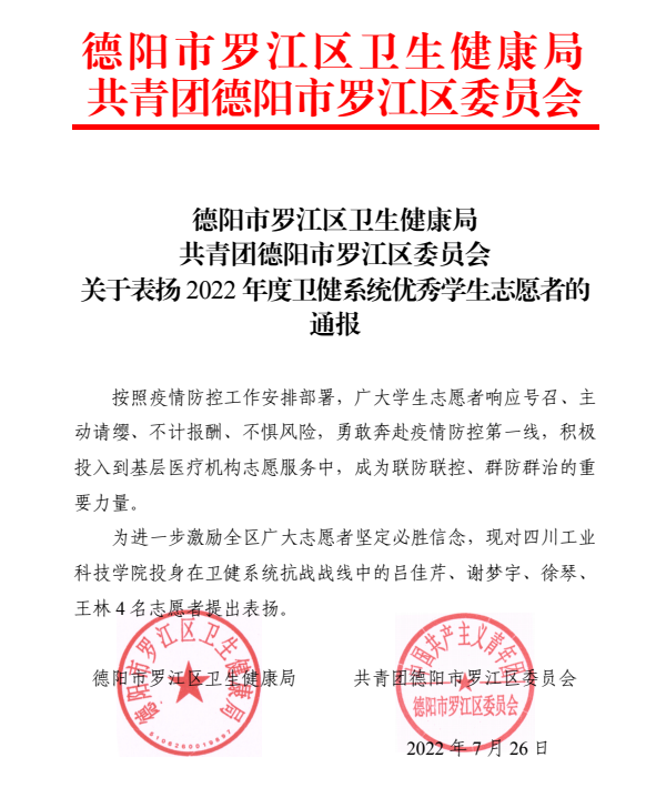 近日,罗江区卫健局、区团委联合发文,表彰了2022年度积极投身基层医疗机构志愿服务中表现突出的个人。我校体育与健康学院护理系吕佳芹、谢梦宇、徐琴、王林4名同学获得“优秀志愿者”称号。