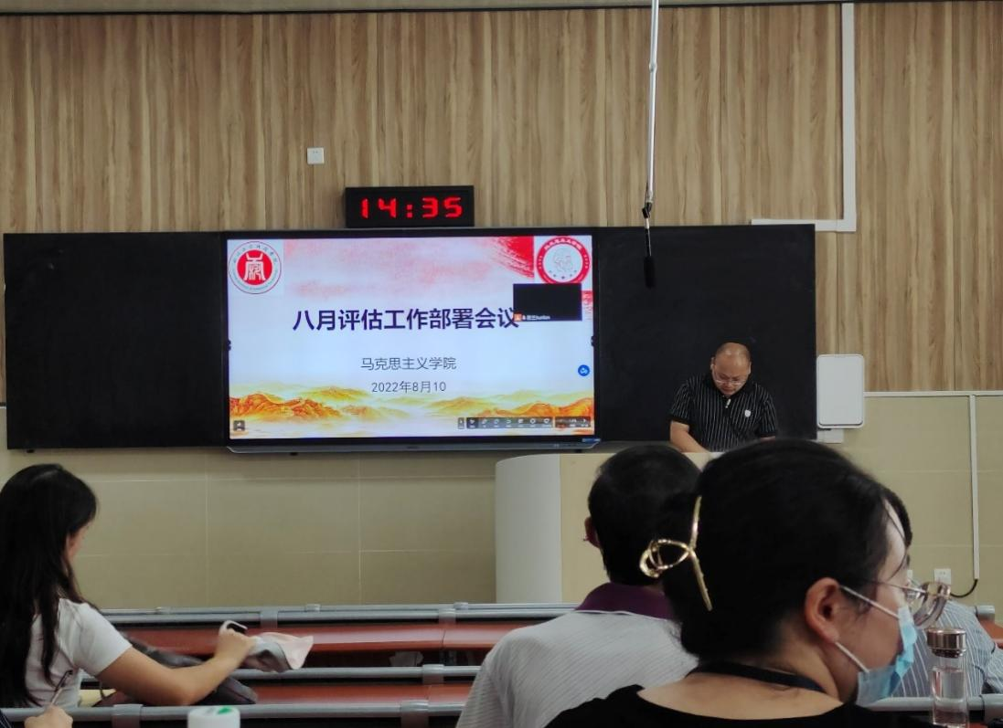 应评估工作需要,8月10日下午,马克思主义学院于B212教室召开全体教师会议,为下一步评估工作做了具体的安排。此次会议采取线下线上结合的模式,将会议精神传达至每一位老师。
