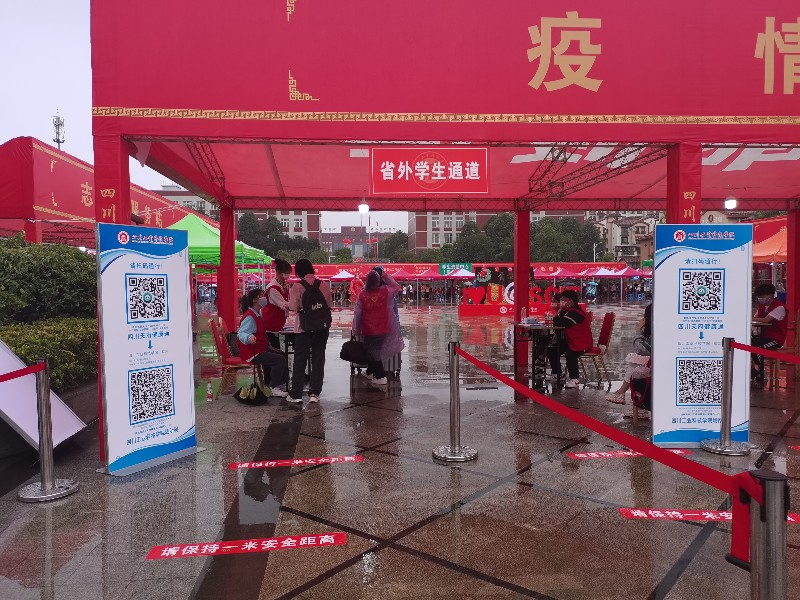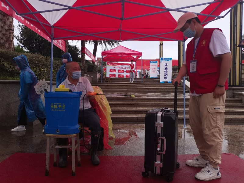 在学校迎新场地,最先映入眼帘的便是疫情防控工作专区,设有省内学生通道、省外学生通道、行李消毒区、体温测量区和信息登记区,同时学工部(处)安排专人负责学生防疫相关工作,做到迎新防疫措施科学化、精准化、人性化。前来报到的新生,在“红马甲”的协助下,先进入行李消毒区,给新生携带的行李进行全面消杀后,再进入体温检测区,待体温测量正常后,再进入信息登记区。学生志愿者严格按照省内外防疫要求,详尽查验核酸检测报告、健康码和通讯数据行程卡,完全符合防疫要求的新生方可进入报到场地。
