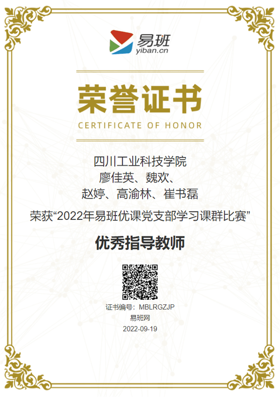 近日,学校在教育部易班网主办的“2022年易班优课党建学习课群比赛”和“2022年易班优课党支部学习课群比赛”中荣获优秀组织奖,其中廖佳英、魏欢、赵婷、高渝林、崔书磊五位老师荣获优秀指导老师称号。