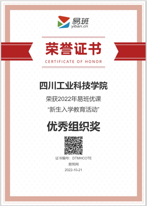 近日,从教育部易班发展中心获悉,学校易班荣获2022年易班优课“新生入学教育活动”优秀组织奖。