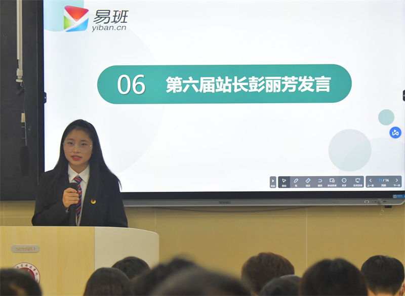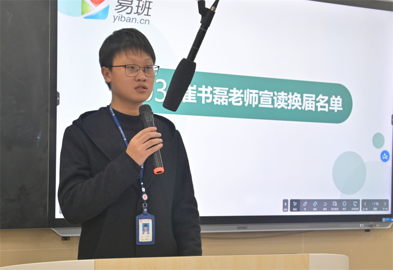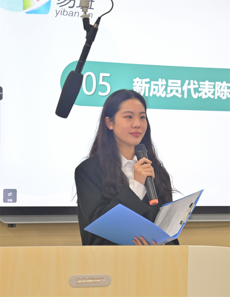 随后,崔书磊老师宣读了第六届易班学生工作站成员任命通知。第五届易班学生工作站站长黄浩旻对过去一年的工作进行了总结,从“不忘初心”“心怀责任”“力求上进”三点对新一届易班成员提出希望,鼓励大家再创易班新辉煌。新生代表陈玉洁表达了自己对易班的热爱,并向呼吁全体新成员为易班的发展出谋划策、贡献力量,不负青春,不负韶华。第六届易班学生工作站站长彭丽芳向成员们分享了自己在工作上的经验,并从规范规章制度、加强联系与合作、完善培训机制、开展优质服务、创新发展等方面部署了接下来的工作。