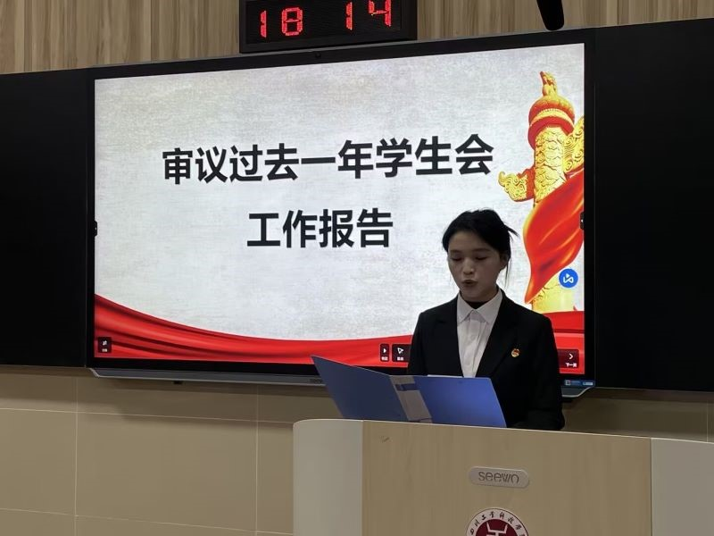 学生代表王菁菁进行上一学年的工作汇报,对工作进行展示分析。魏来老师宣布新一届主席名单,主席团代表陈宇进行听取审议提案工作报告。