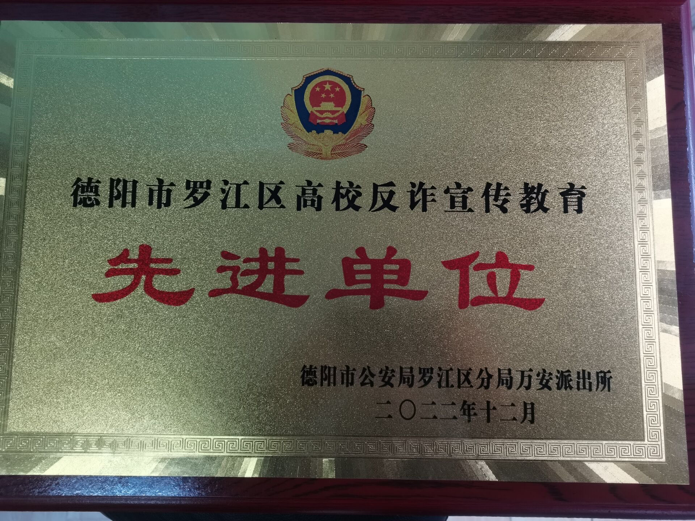 近日,德阳市公安局罗江区分局万安派出所授予学校高校反诈宣传教育先进单位荣誉称号,对学校在防范治理电信网络诈骗制度建设、队伍建设、创新宣传和警情压降等方面取得的成效表示肯定。