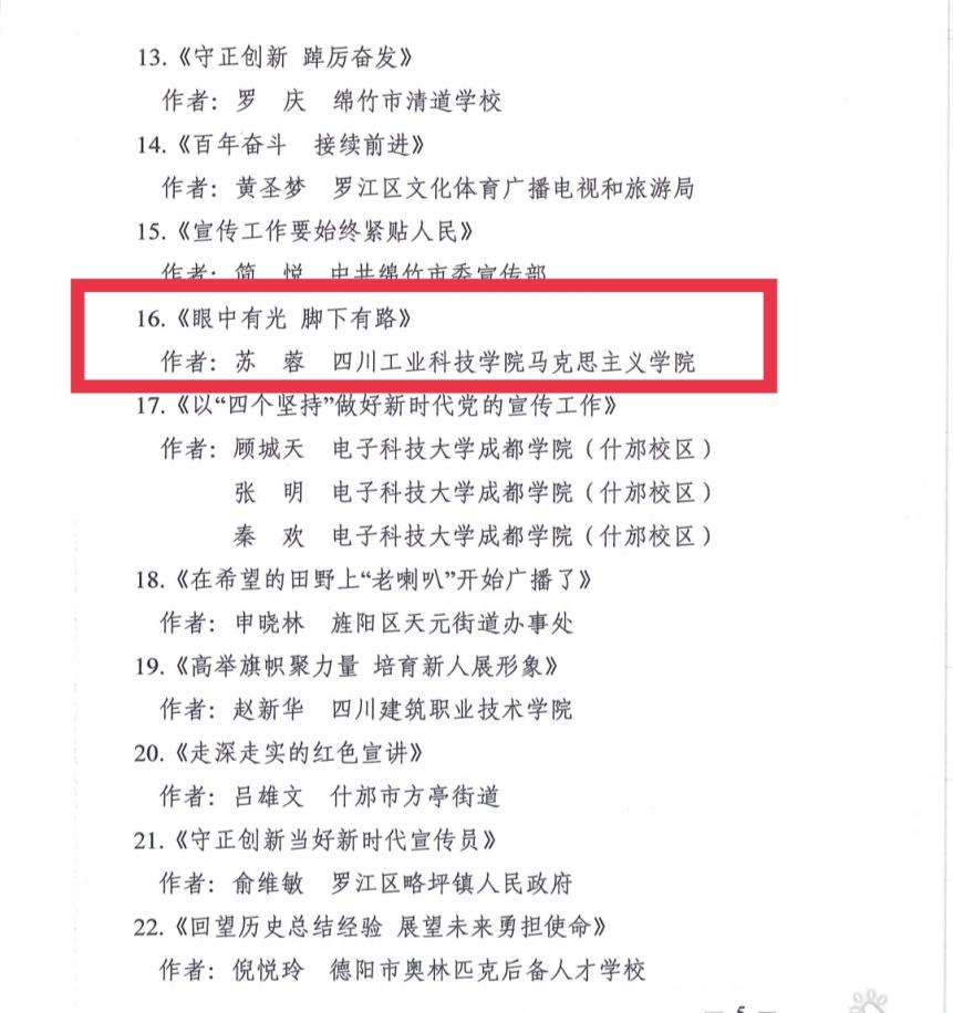 我院教师苏蓉撰写的《眼中有光 脚下有路》一文获得大赛优秀奖。本次大赛旨在推动《中国共产党宣传工作简史》学习使用走深走实,活动开展以来,广大干部职工、文艺工作者、文艺爱好者、理论工作者等积极响应、踊跃参与,创作出一大批旋律昂扬、振奋人心的优秀作品。
