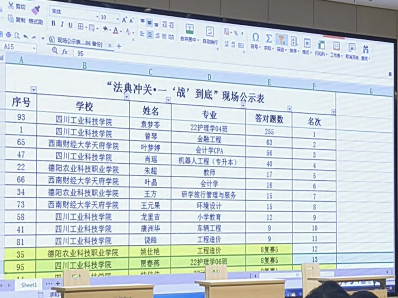 “法典冲关· 一‘战’到底”百人答题挑战赛决赛于5月17日在学校龑江C区报告厅举行,体育与健康学院共有十名同学进入决赛,经过了激烈的法律知识现场挑战答题后,22护理学04班袁梦苓同学回答正确共计255道题,荣获一等奖。