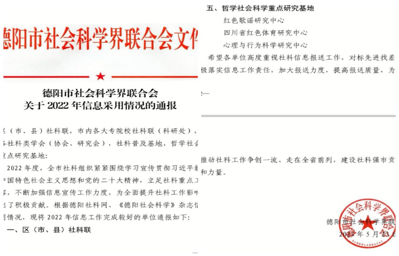 5月23日,德阳市社会科学界联合会通报了2022年信息采用情况,学院红色歌谣研究中心和心理与行为科学研究中心受表扬通报。
