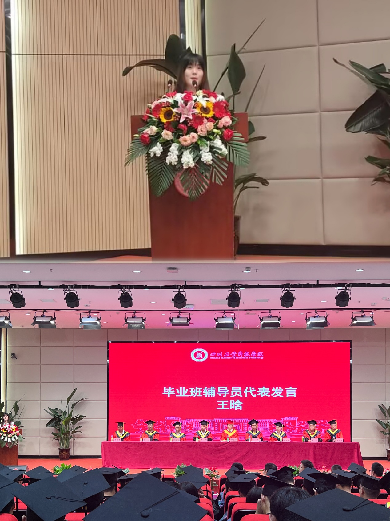 学院辅导员代表王晗向同学们送上了最真挚的祝福。她希望同学们要健康而稳定地成长,接纳生活中的事与愿违与各种艰难,热情地、坚韧地朝着自己设定的标杆走下去。她期待同学们承载着母校的荣耀,肩负国家强盛和民族复兴的伟大历史重任,自觉承担起对国家和社会的责任,从而真正地实现自己的人生价值。