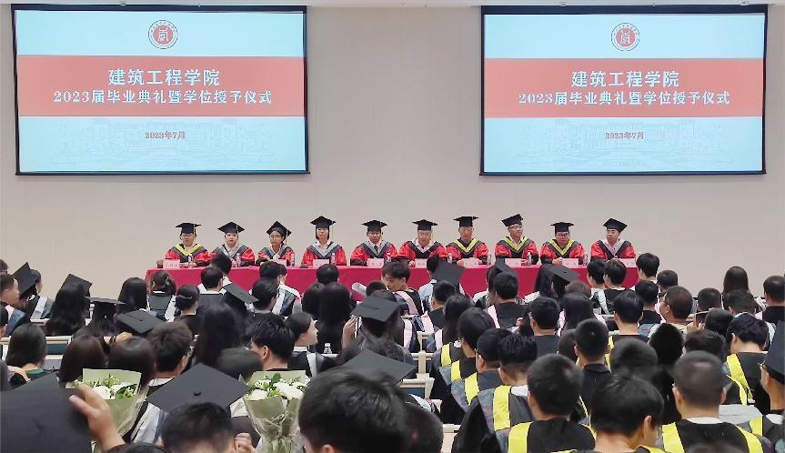 7月8日上午,建筑工程学院在龑江学村B区学术报告厅举办2023届毕业典礼暨学位授予仪式。学校校长助理、建筑工程学院院长陈堂,学院副院长孙芙蓉、党总支副书记张东国、各系部主要负责人、学院教师代表、2023届毕业班辅导员以及四百多名毕业生参加此次毕业典礼。党总支副书记张东国主持会议。