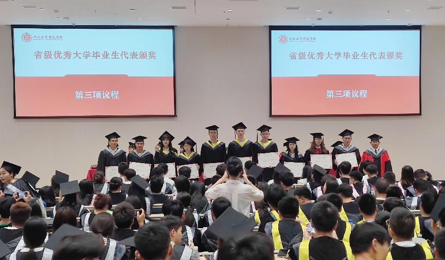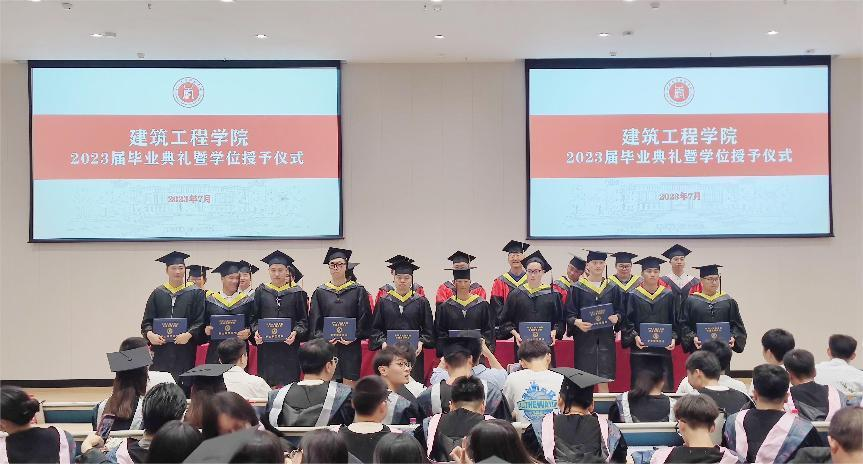 毕业典礼在庄严的国歌声中拉开序幕。副院长孙芙蓉宣读建筑工程学院2023届获得学士学位的毕业生名单和获得省级优秀毕业生名单,校长助理、学院院长陈堂为省级优秀毕业生代表颁发证书。
