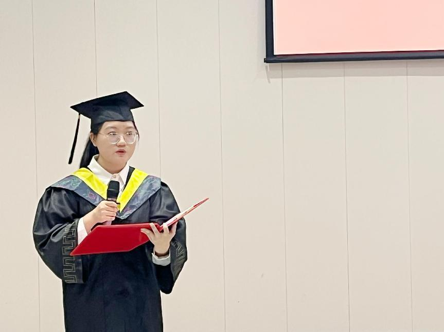 2023届毕业生代表黎李宝,代表全体2023届毕业生发表毕业感言。她回顾了四年的求学生涯,并向母校和全体教职工的辛勤培育付出致以最崇高的敬意,并郑重承诺:以青春之名,赴时代之约;勇担时代重任,绽放青春底色。