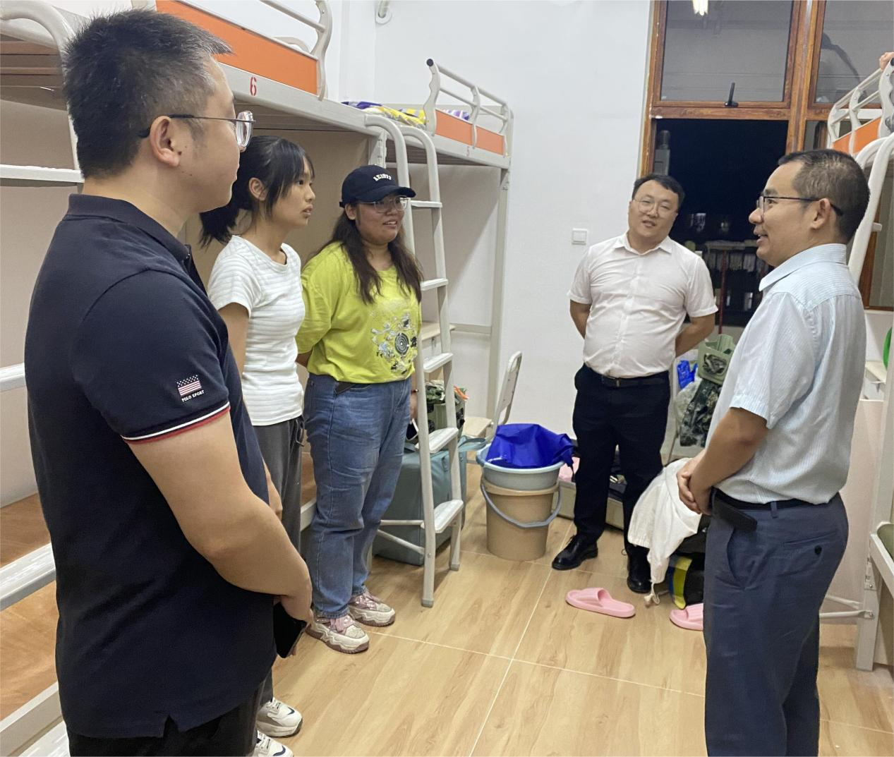 为深化“三全”育人工作效果,帮助2023级新生尽快适应大学生活,了解他们入学以来的适应情况。8月29日晚,校长助理、建筑工程学院院长陈堂,教务处副处长宋文正与学院党政班子成员、新生班级辅导员共同深入新生宿舍看望学院新生。