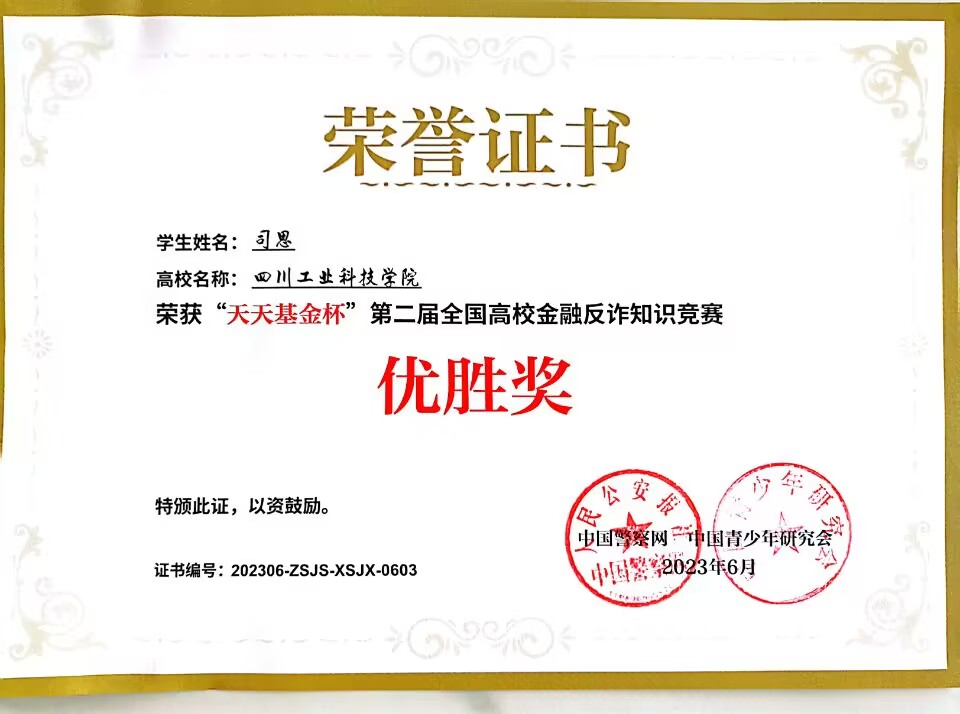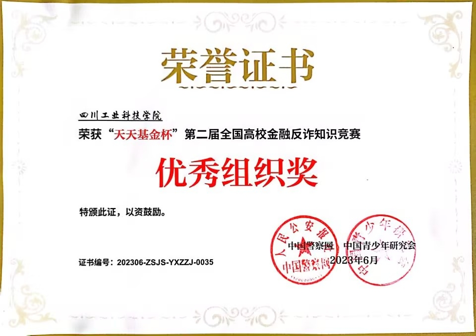 由中国警察网、中国青少年研究会举办的“天天基金杯”第二届全国高校金融反诈知识竞赛日前结束,我校荣获“优秀组织奖”,张言、周文雪、郑华琳、司思四位同学荣获优胜奖。
