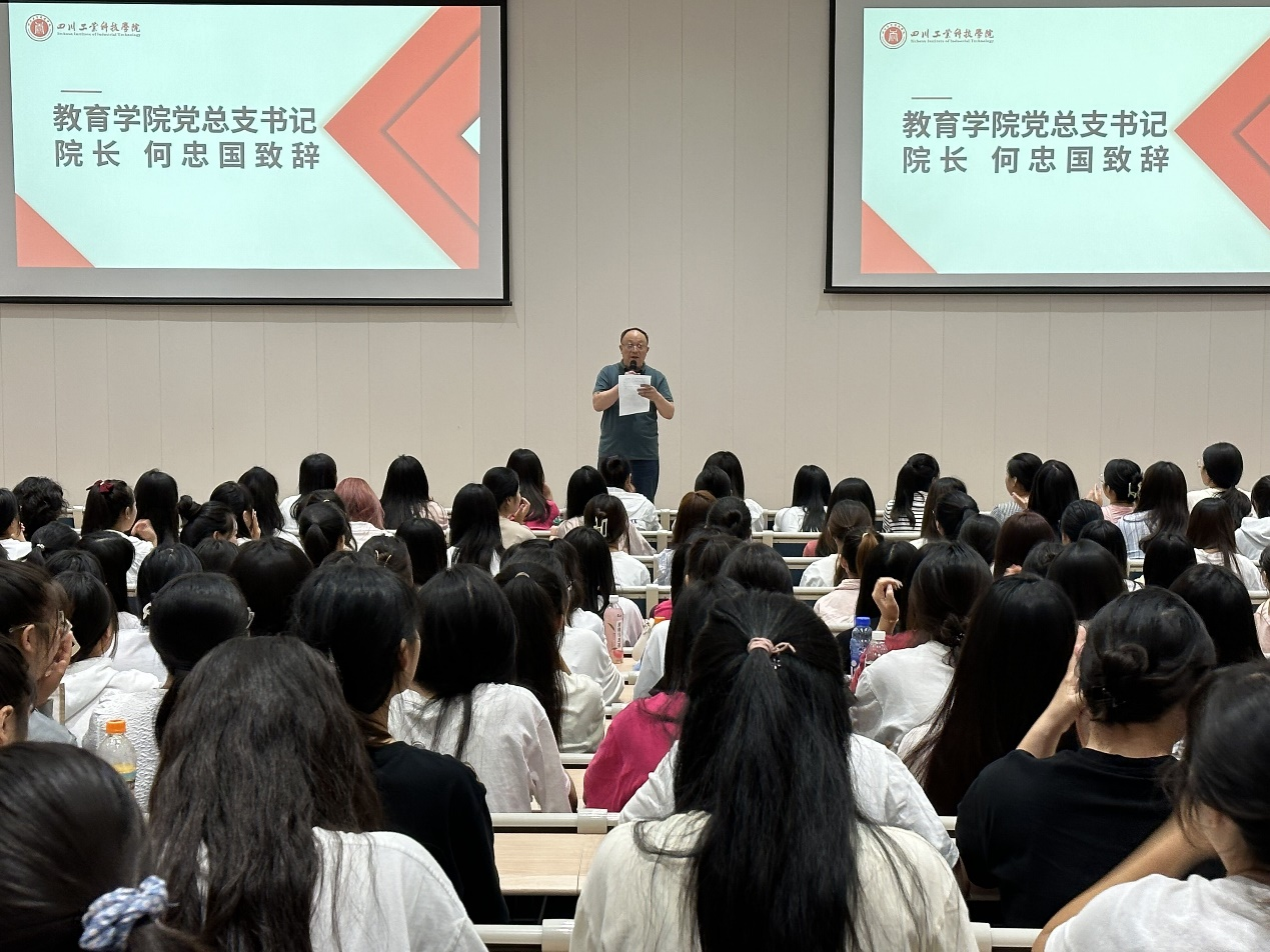 在8月27日的会议中,教育学院党总支副书记何彬代表全院师生向各位新同学表示最诚挚的祝贺及最热烈的欢迎。何书记首先介绍了自己所负责的党务方面的工作,再向同学们解读“国家奖学金”“国家励志奖学金”等高校国家奖助学金政策,并介绍了“创新创业实践学分”的相关内容。在对新生的寄语中,何书记希望大家谨记遵守学校规章制度、懂礼节,做好职业规划,要做到“凡事有交代、件件有着落、事事有回应”。