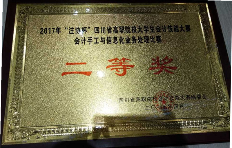 由四川省教育厅主办的2017年“注协杯”四川省高职院校大学生会计技能大赛于4月8日圆满结束。我校财经学院派出2015级会计电算化专业冯迪、周银银、蒋丹、何悦四位同学组队参赛,并荣获团体二等奖,这也是该院连续5年参加该项赛事获奖。