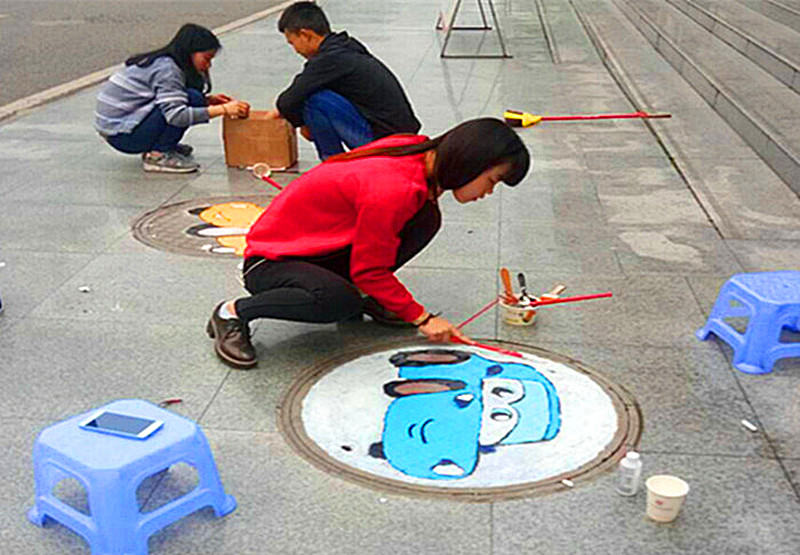原来他们是交通学院的学生,正在为学校井盖穿漂亮的衣服,他们将一个个原本冰冷的井盖变成了《汽车总动员》里可爱的卡通汽车形象,这既符合交通学院特色又能让同学们在绘画中切磋技艺、增进友谊。