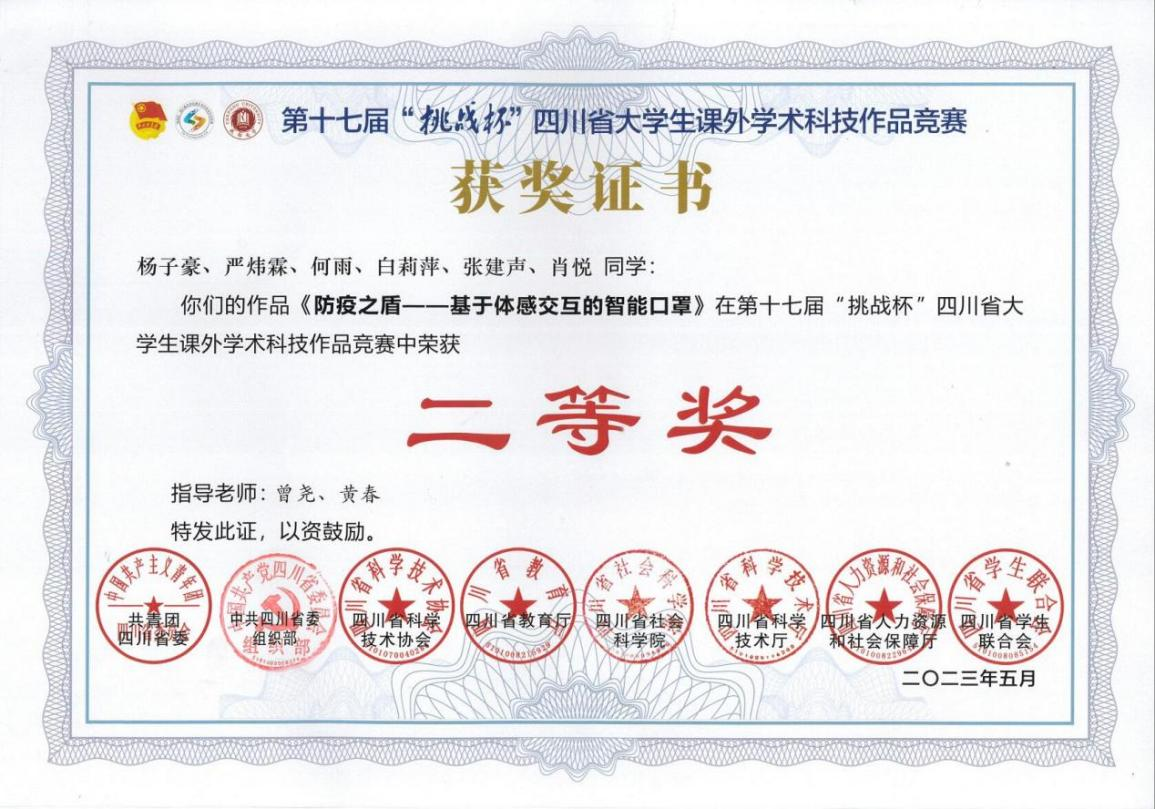 近日,由四川工业科技学院团委联合电子信息与计算机工程学院和创新创业学院,共同带领电信学院学生参加的第十七届“挑战杯”四川省大学生课外学术科技作品竞赛四川省决赛成绩公布。在众多参赛项目中,电信学院学生杨子豪及其团队负责的项目《防疫之盾》经过层层选拔,最终荣获四川省二等奖。