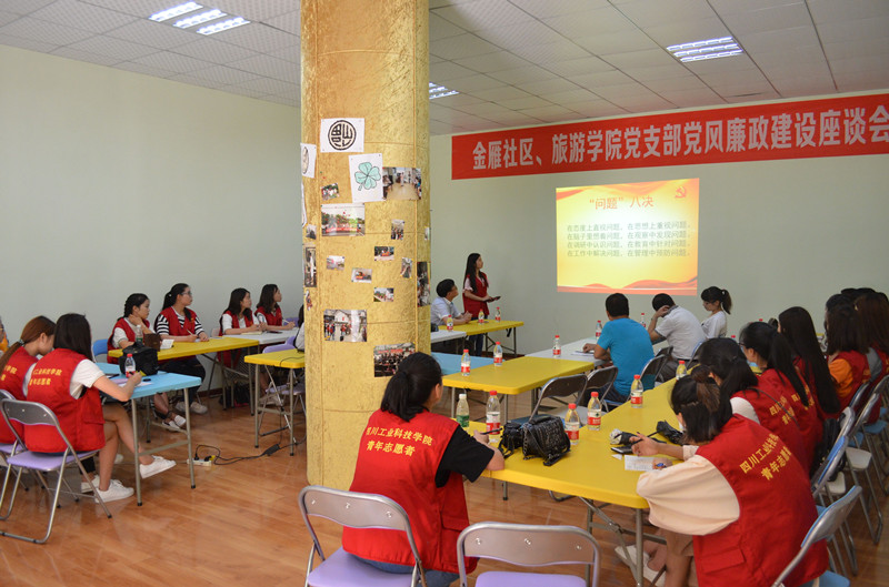5月26日下午,旅游学院党支部第23期30余名党校学员与金雁社区联合开展以“凝聚青春力量,争做合格党员”为主题的党风廉政建设教育实践座谈会。罗江县民政局纪检组长黄兴明、金雁社区党支部书记赖晓娟、旅游学院支部副书记何林贵出席座谈会。