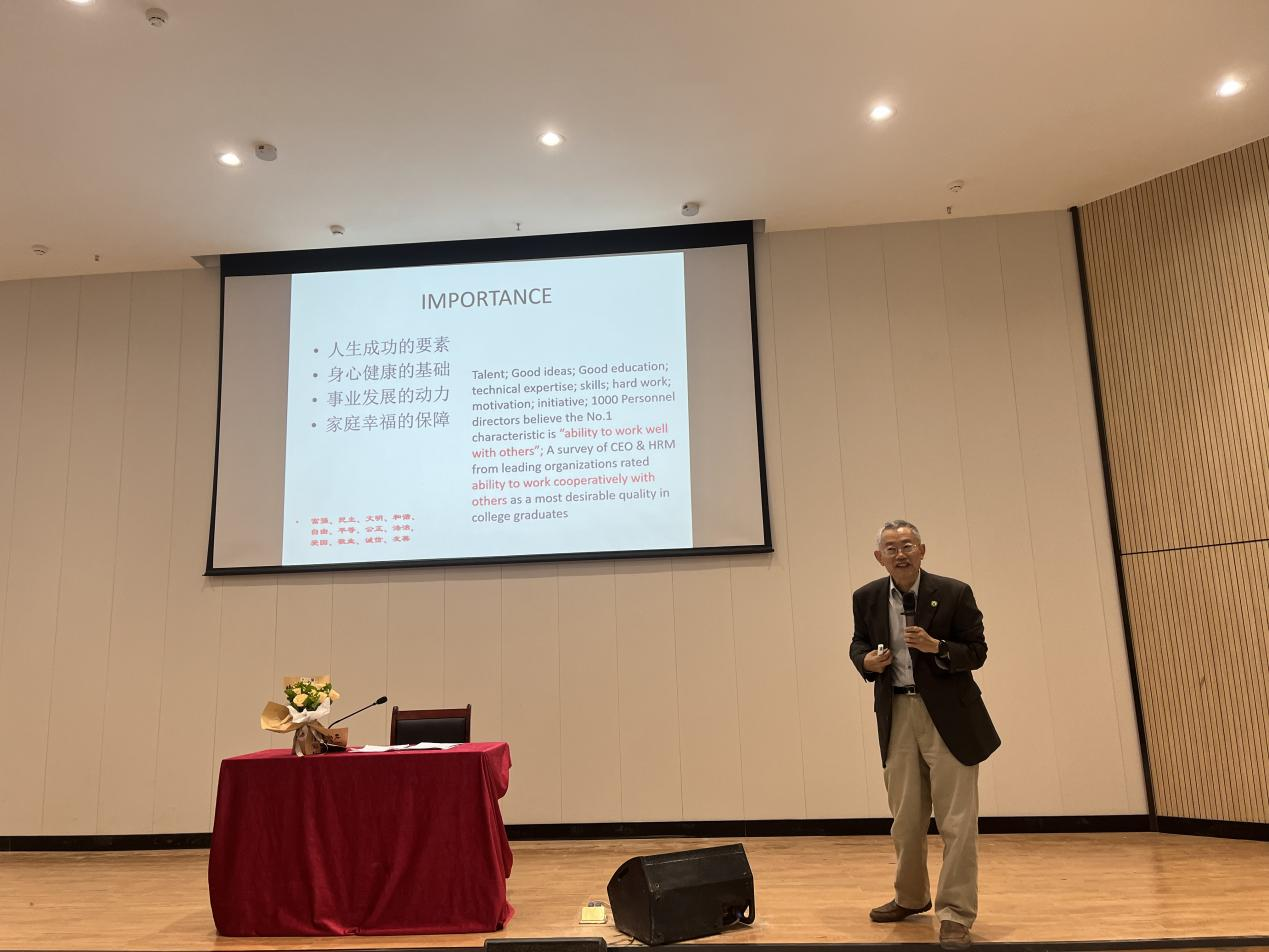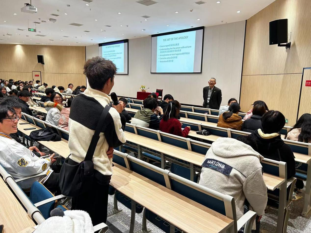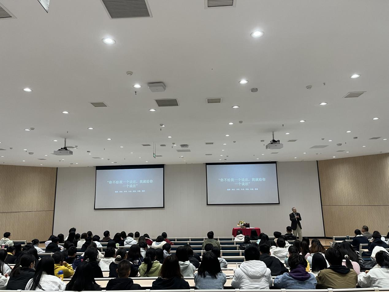 11月21日晚,学校国际交流与合作部部长邓洪教授在龑江C区报告厅开展题为《人缘关系技能及冲突管理》的专题讲座,国际交流与合作部教师及300余名学生参加。讲座由刘棠欢老师主持。